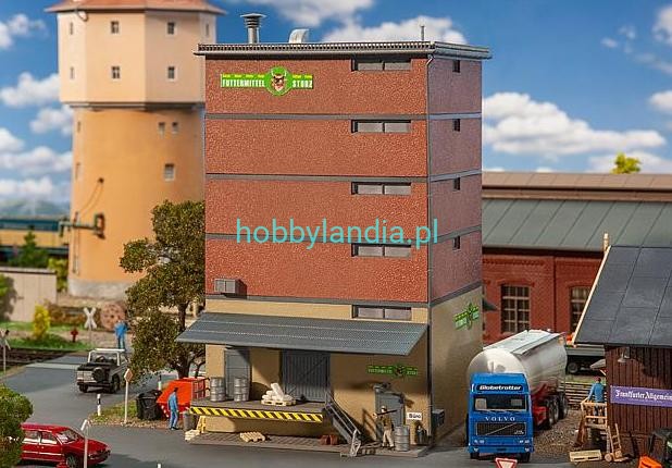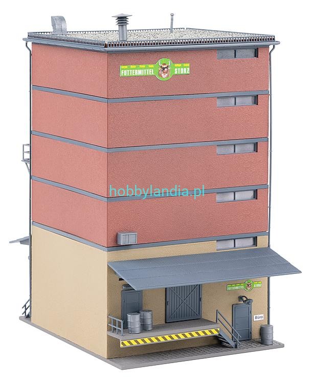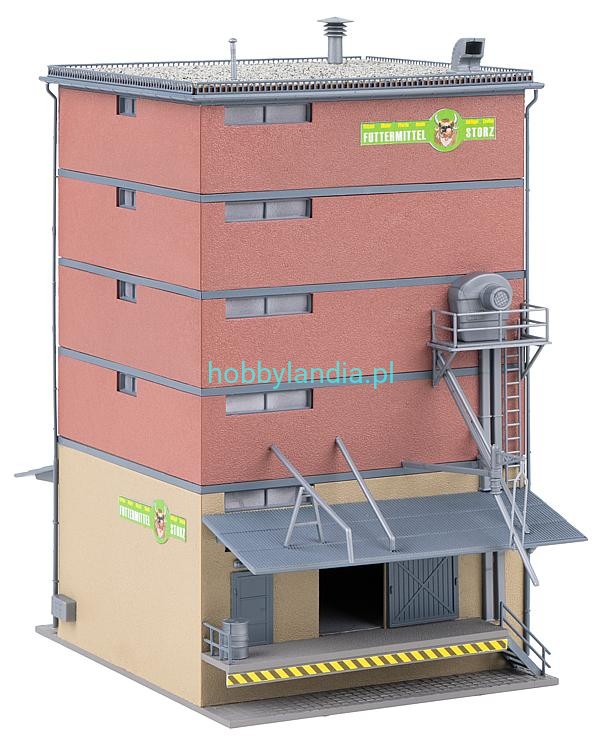 Wielopiętrowa fabryka pasz z 2 krytymi rampami załadunkowymi.