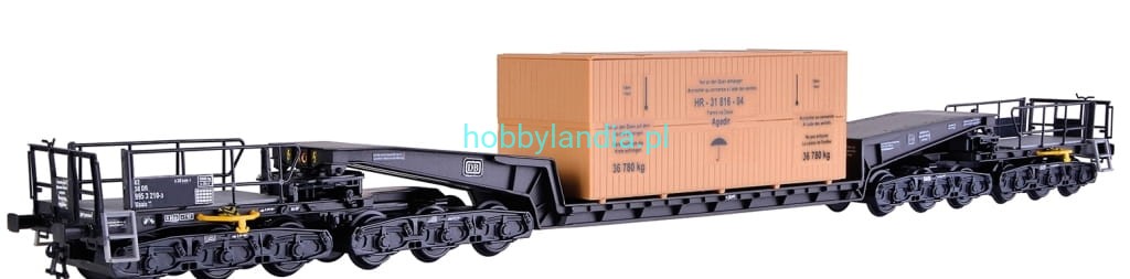 12-osiowy wagon platforma niskopodłogowa Union Uaai 819 z drewnianym kontenerem, model do sklejania H0 1:87, Kibri 16510.