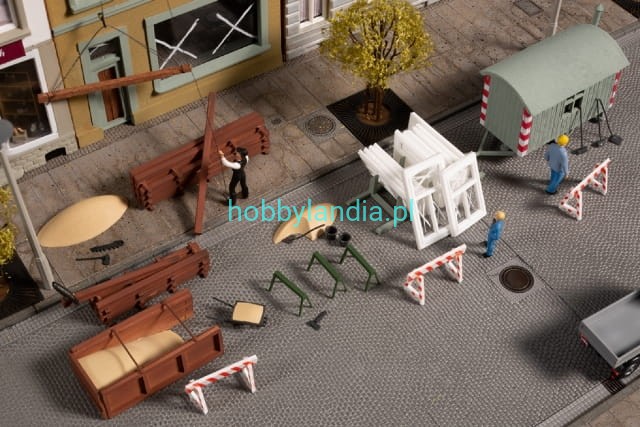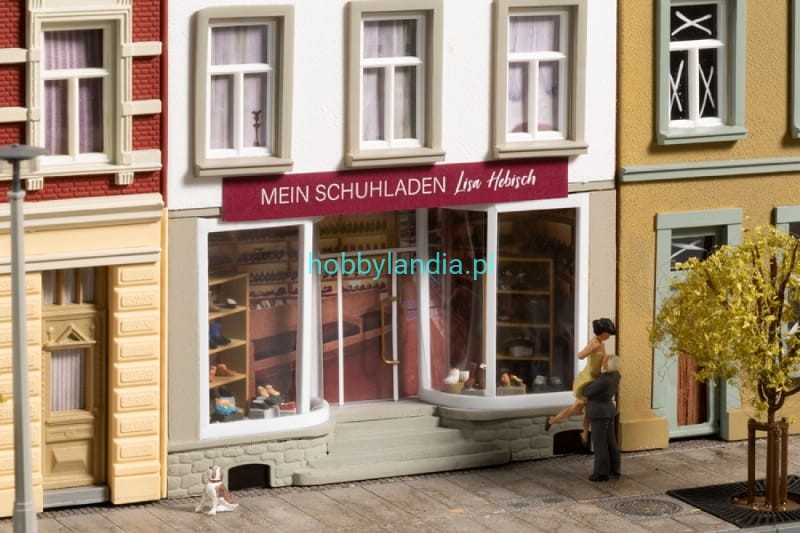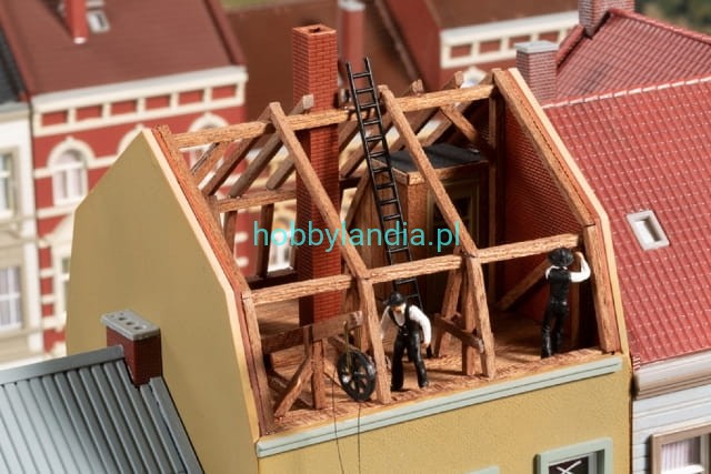 Model do sklejania. Jedna z kamienic w remoncie, druga ze sklepem obuwniczym. W zestawie są też akcesoria budowlane.