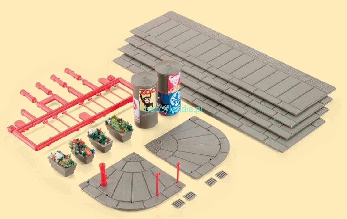 W zestawie 6 "płyt" chodnika: 4 płyty proste i 2 krawężniki, a także dodatki: donice z kwiatami, hydranty, słupy ogłoszeniowe.