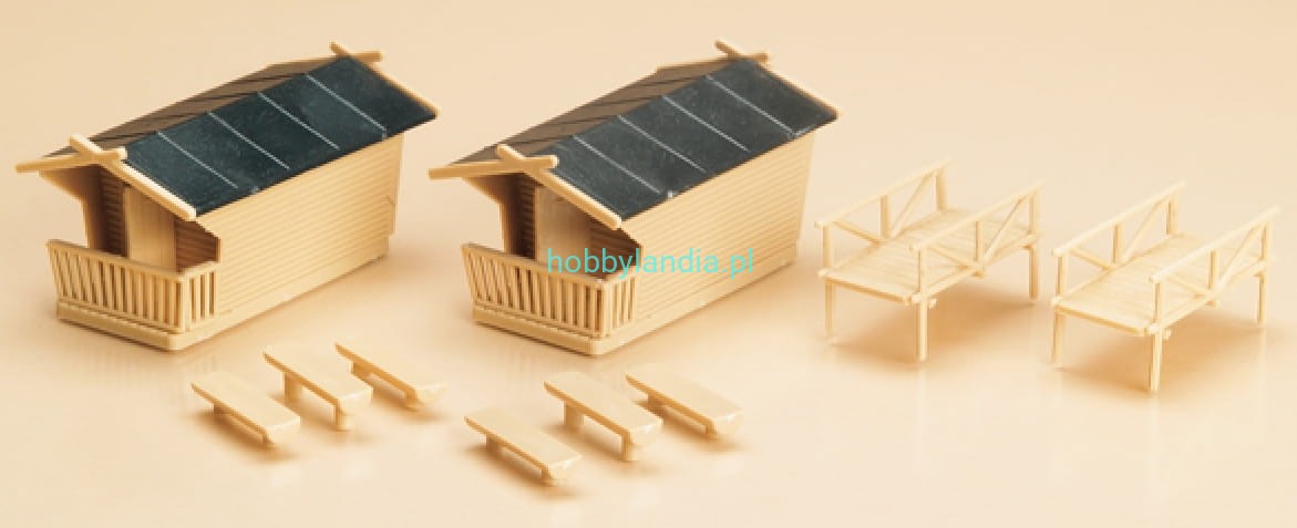 W zestawie: domki, 2 mostki, 2 stoły i 4 ławki.