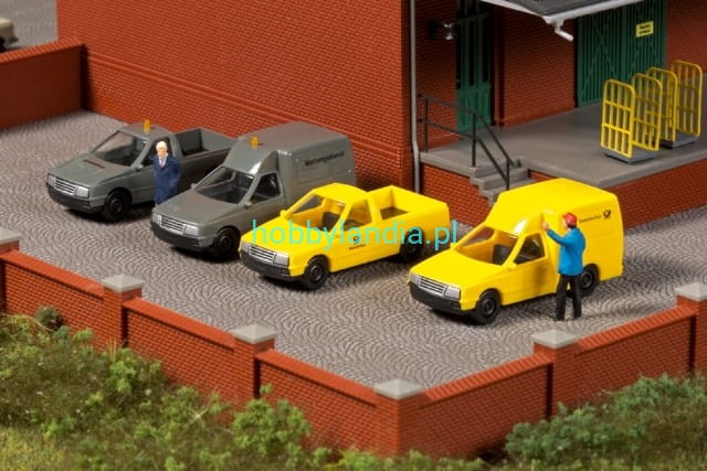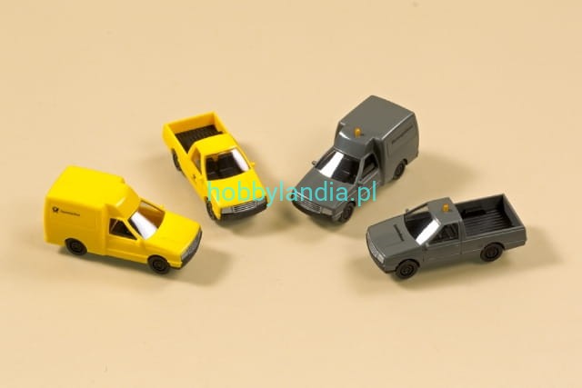 Gotowy model. W zestawie: 2 furgonetki oraz 2 pickupy.
