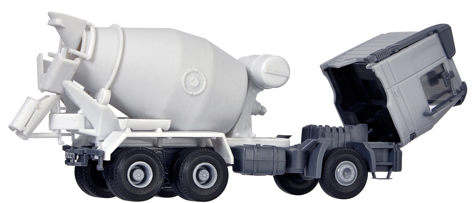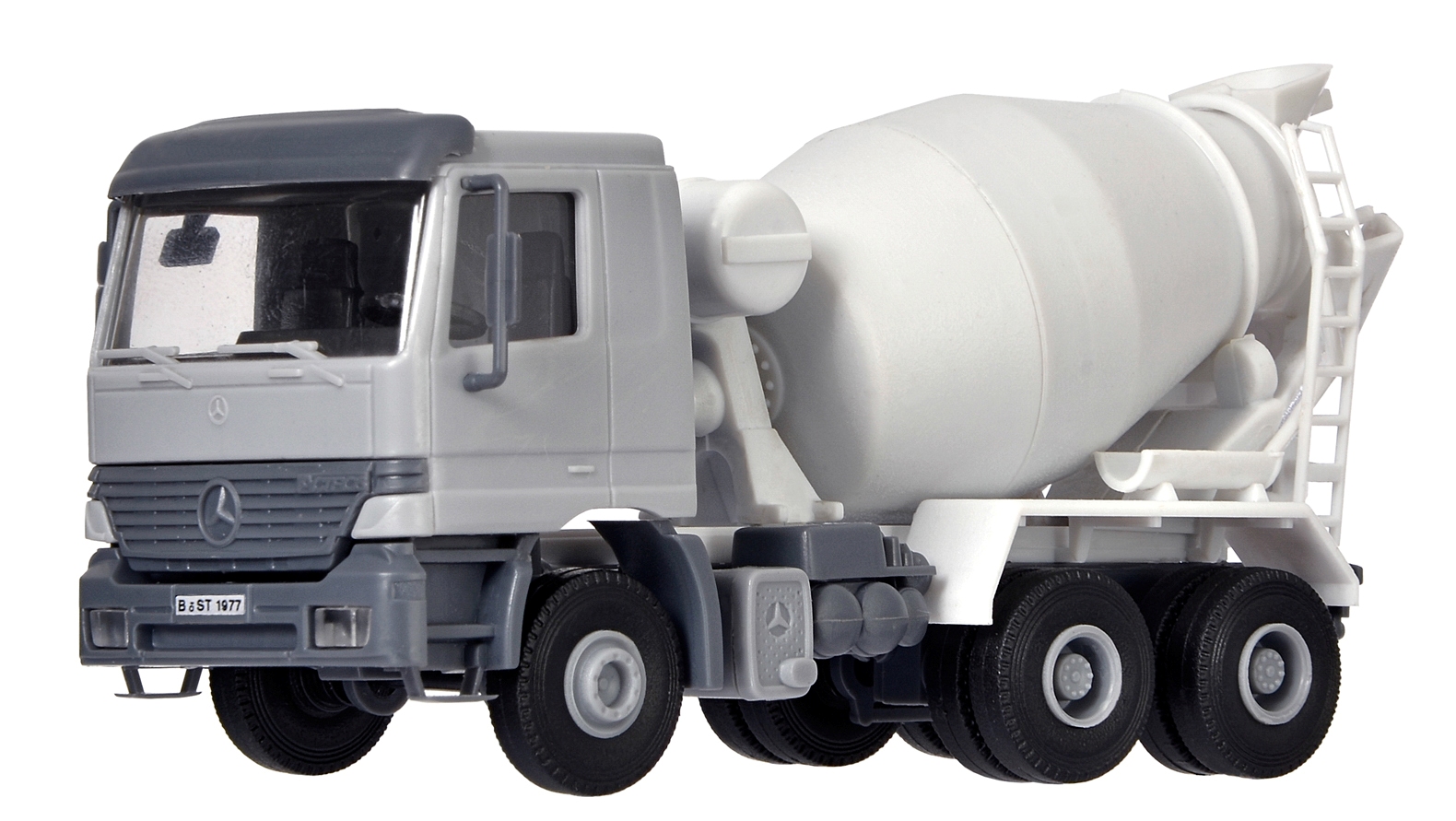 Model 3-osiowej betoniarki Mercedes Actros w skali H0-1:87 do złożenia.