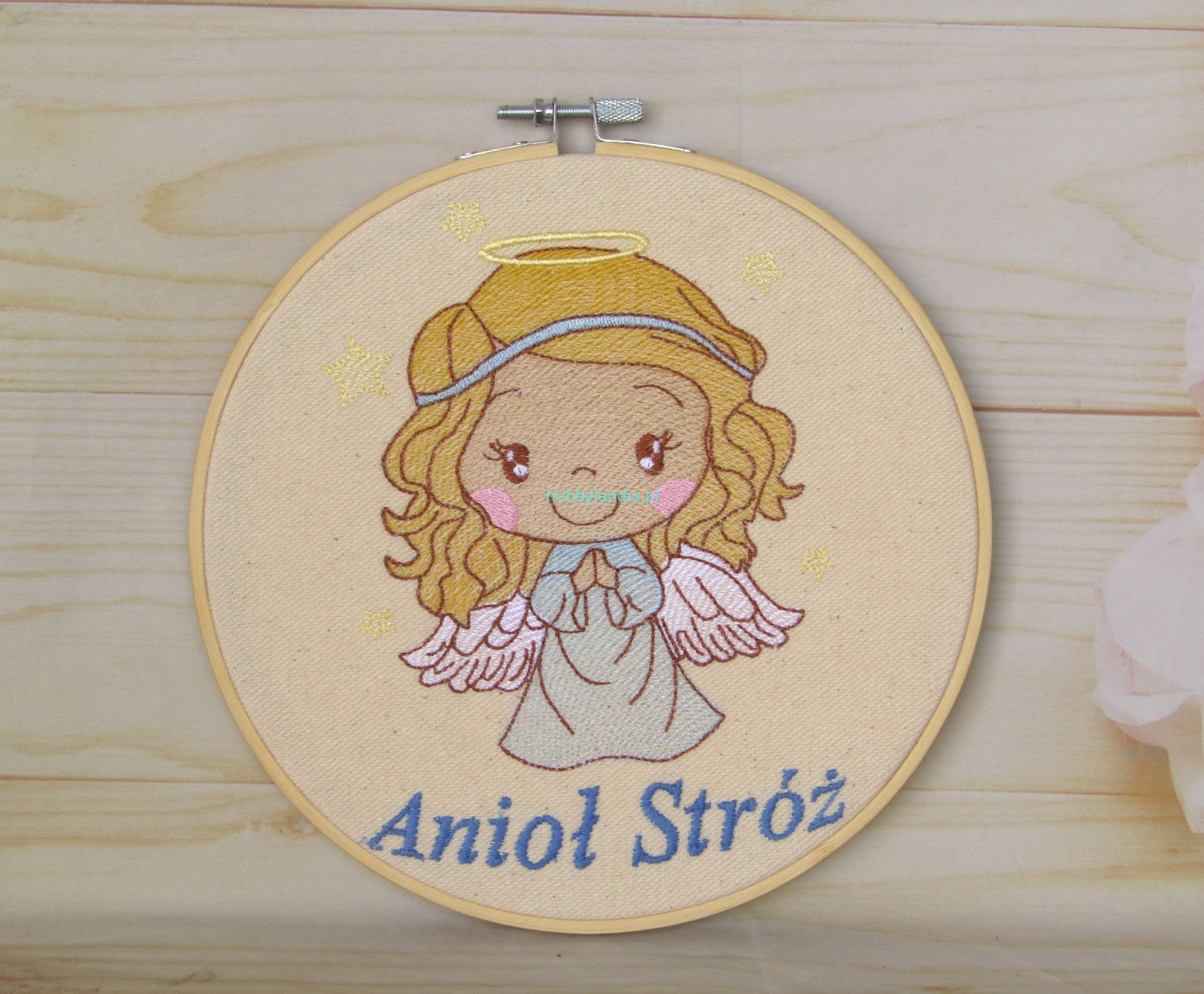Haftowany drewniany tamborek z nowoczesnym motywem Anioła Stróża.