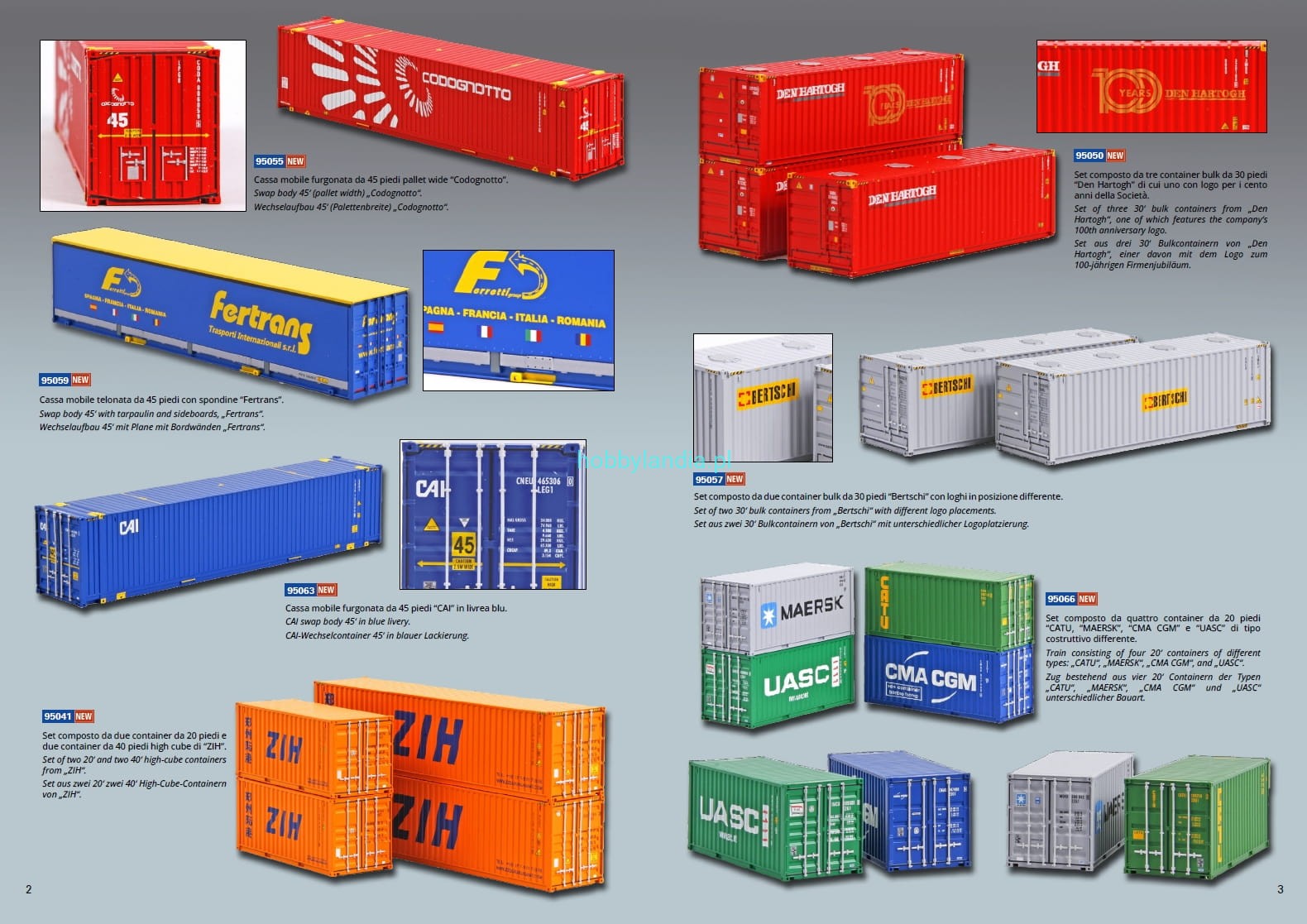 Kontenery 20-, 30-, i 45-stopowe 3 pojedyncze i 4 w zestawie (7 opcji) H0-1:87, ACME 95041, 95050, 95055, 95057, 95059, 95063 i 95066.