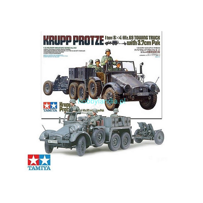 Niemiecki ciągnik transporter Krupp Protze 1ton (6x4) Kfz.69 z działem i figurkami with 3,7 cm Pak 36 and crew w skali 1:35 do sklejania, Tamiya 35259.