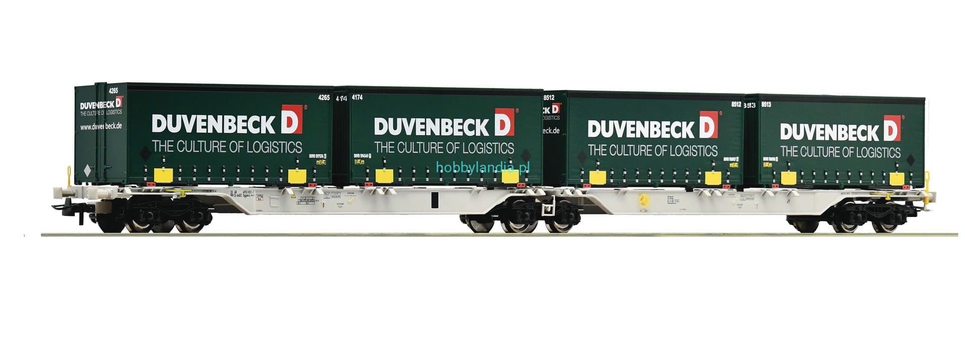 Wagon platforma intermodalna typu Sggmrs H0 1:87 z 4 kontenerami Duvenbeck, Roco 76635. Nowość Roco 2022.