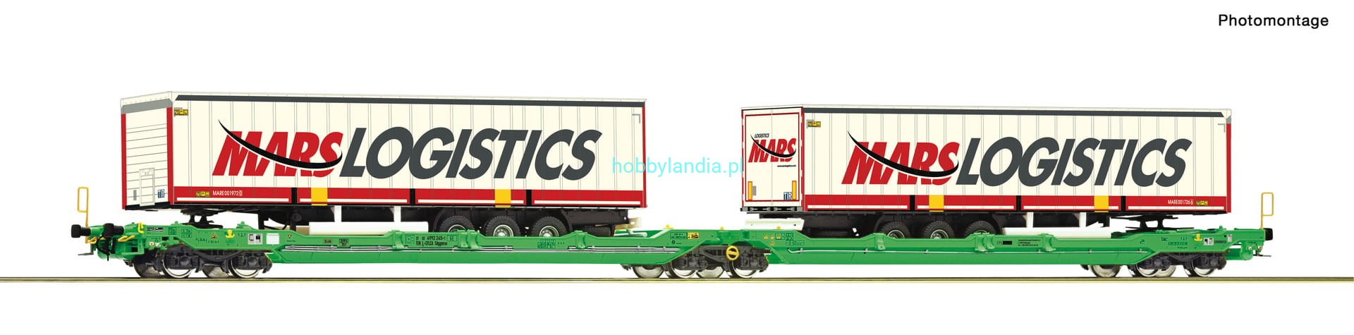 Wagon intermodalny kieszeniowy podwójny typu Sdggmrss/T3000e H0-1:87 CFL Cargo z ładunkiem 2 naczep MARS Logistics ep. VI, Roco 6600005. Nowość Roco 2025.