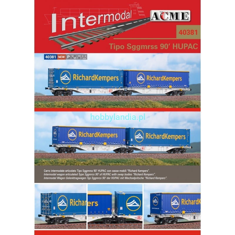Wagon platforma podwójna typ Sggmrss 90’ H0-1:87 Hupac ep. V-VI z 2 kontenerami “Richard Kempers”, ACME 40381. Nowość 2023.