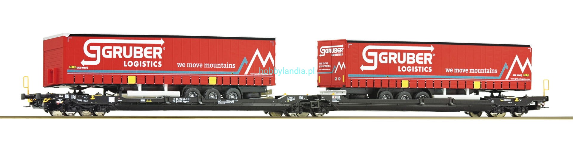 Wagon podwójny Sdggmrs 738/T3000e ep. VI H0 1:87 z naczepami "Spedition Gruber Logistics", Roco 77397. Nowość Roco 2021.