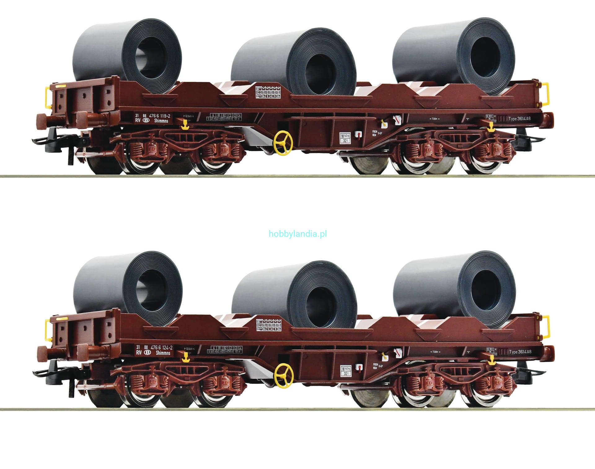 2 wagony platformy do transportu stalowych rolek H0 1:87 z ładunkiem, Roco 76338. Nowość 2023 roku.