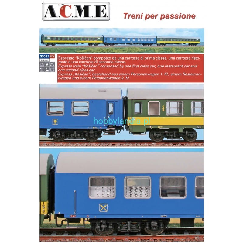 Zestaw 3 wagonów 4-osiowych osobowych ekspresu Kosican CSD ep. IV-V, Set A w H0-1:87, ACME 55301. Nowość 2023.