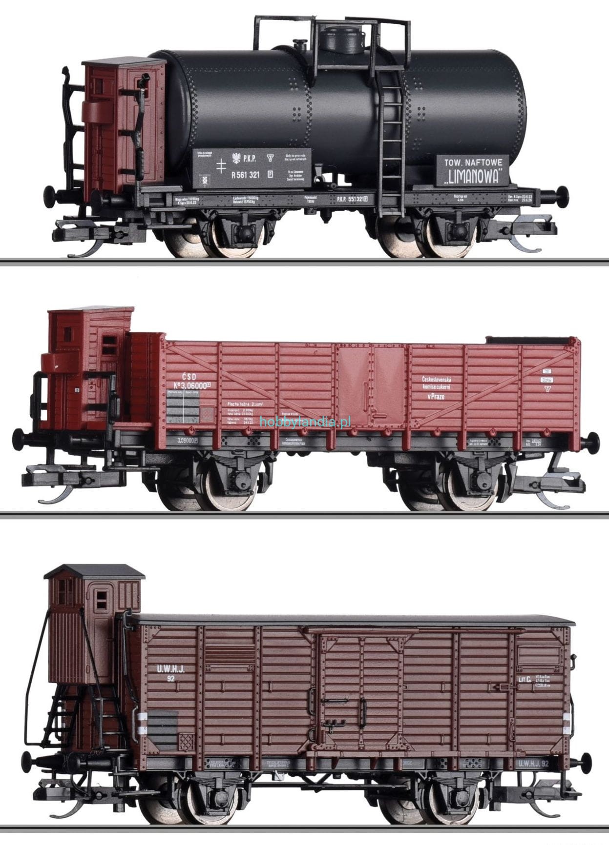 Zestaw 3 wagonów towarowych TT-1:120 UWHJ, PKP i CSD ep. II, Tillig 01031, NA ZAMÓWIENIE
