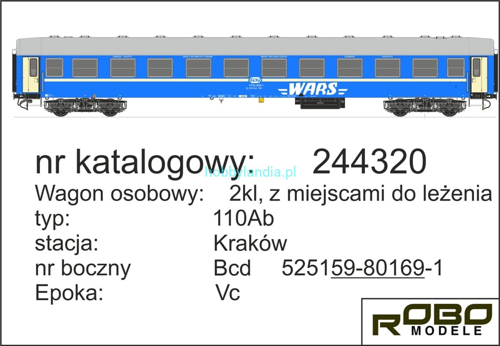 Wagon osobowy kuszetka 2. kl. 111Ab PKP Kraków H0 1:87, Robo 244320. Nowość 2020-2021 roku.