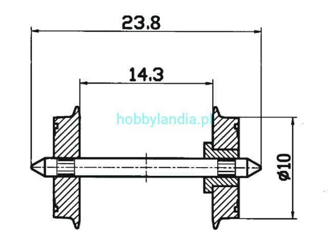 Długość osi 23,8 mm, średnica kół 10 mm.
