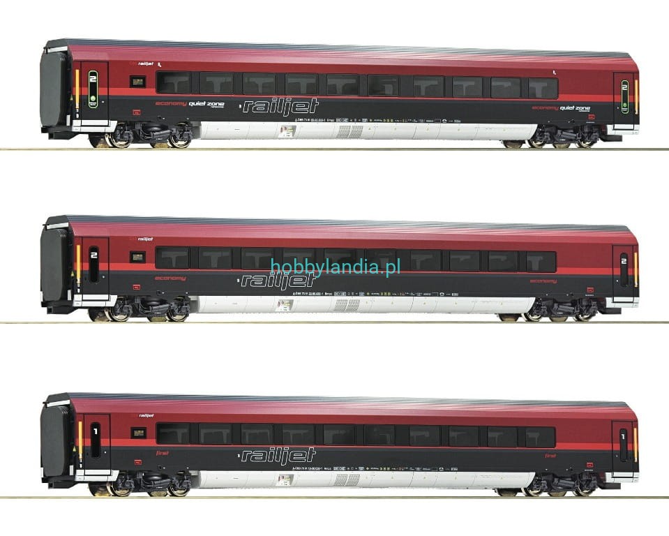 3 wagony pasażerskie Railjet H0 1:87, Roco 74086.