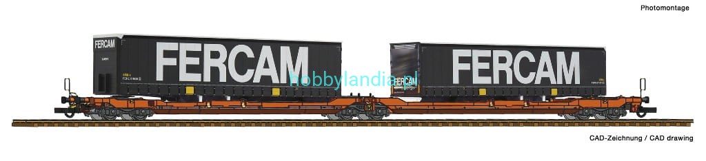 Wagon platforma podwójna Sdggmrs 738 / T3000e H0 1:87 z 2 naczepami Fercam, Roco 77394. Nowość Roco 2021.
