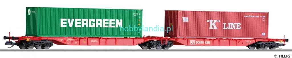 Wagon towarowy platforma Sggmrs DB AG TT 1:120 z kontenerami 40 ft Evergreen i K-Line, Tillig 18033. Nowość 2020 roku.